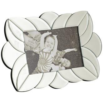 The contemporary design of this fantastic picture frame features silver mirrored glass flower petal-like shapes surrounding a rectangular opening. Ideal for a transitional style or modern decor. Holds a 7"x10" photograph. Mirrored silver glass and cardboard. 10" high. 7" wide..../ Mirrored Silver 10" High Picture Frame / Walls Mirrored